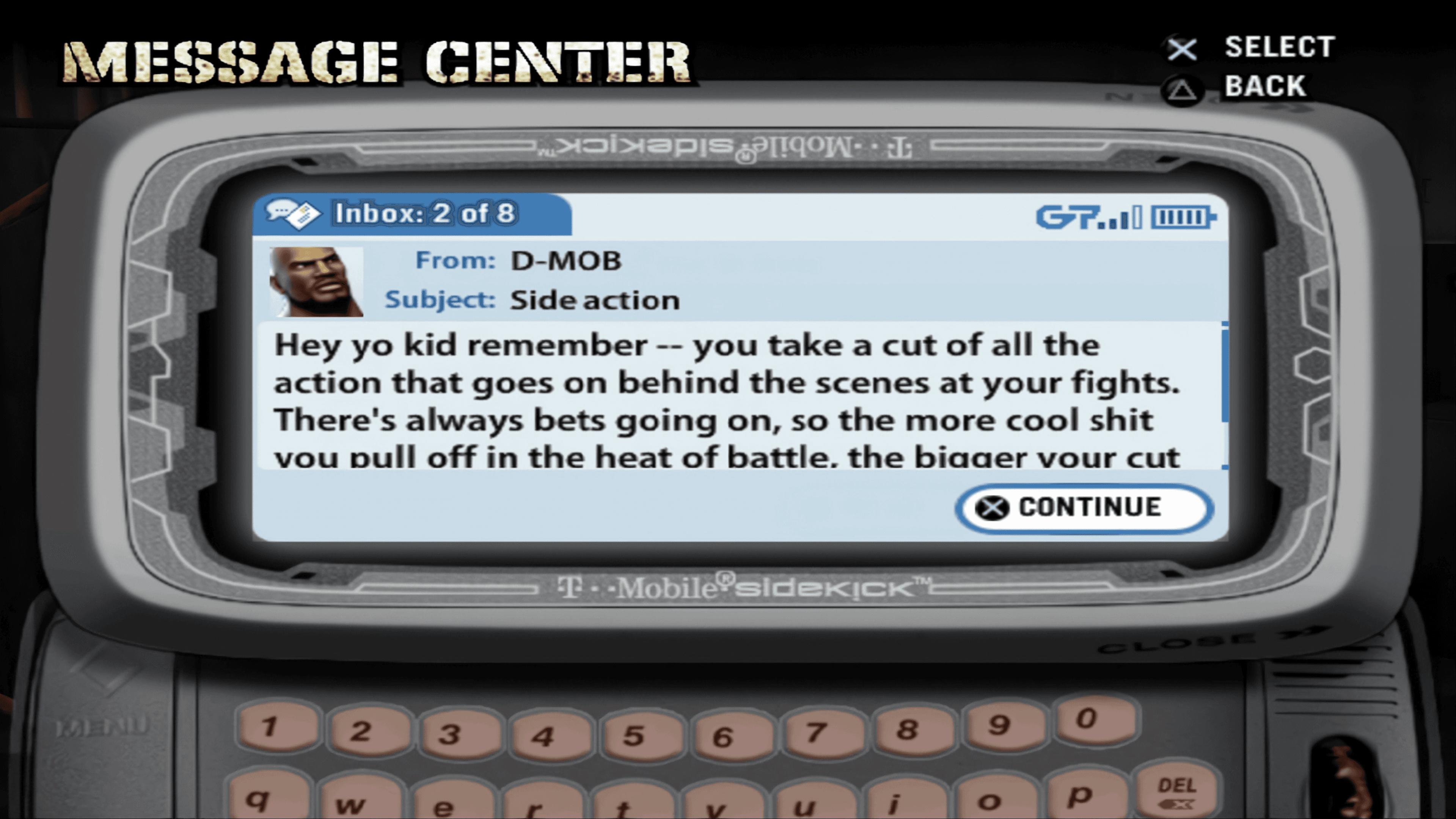 The sense of immersion was further grounded by the way the story mode handled its narrative progression. Between fights, players interacted with the game’s world through a dedicated Message Center designed to look like the T-Mobile Sidekick, the definitive communication tool of the period. Receiving messages from characters like D-Mob, written in the specific slang and vernacular of the early 2000s, added a layer of social realism to the campaign. It was a subtle detail that made the underground hierarchy feel genuine.