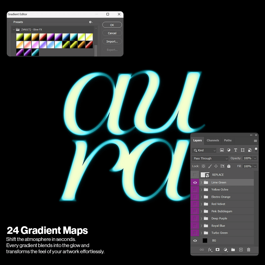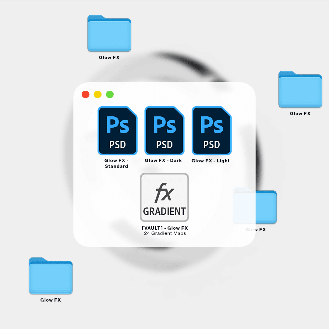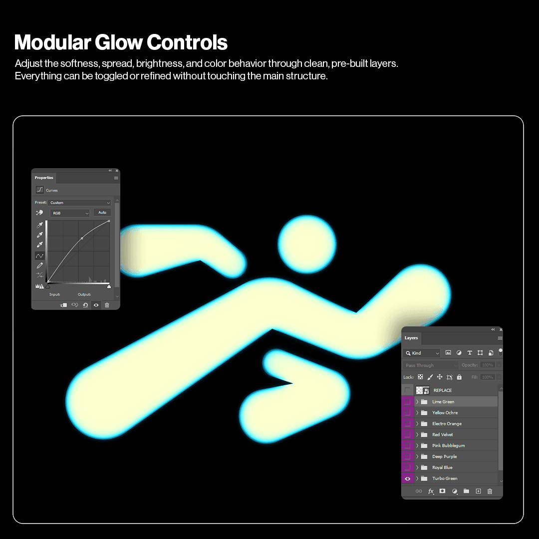 Glow FX gives you a fully organized file where all of that is already set. Insert your artwork, choose a color variation, and adjust the glow strength in just a few clicks.