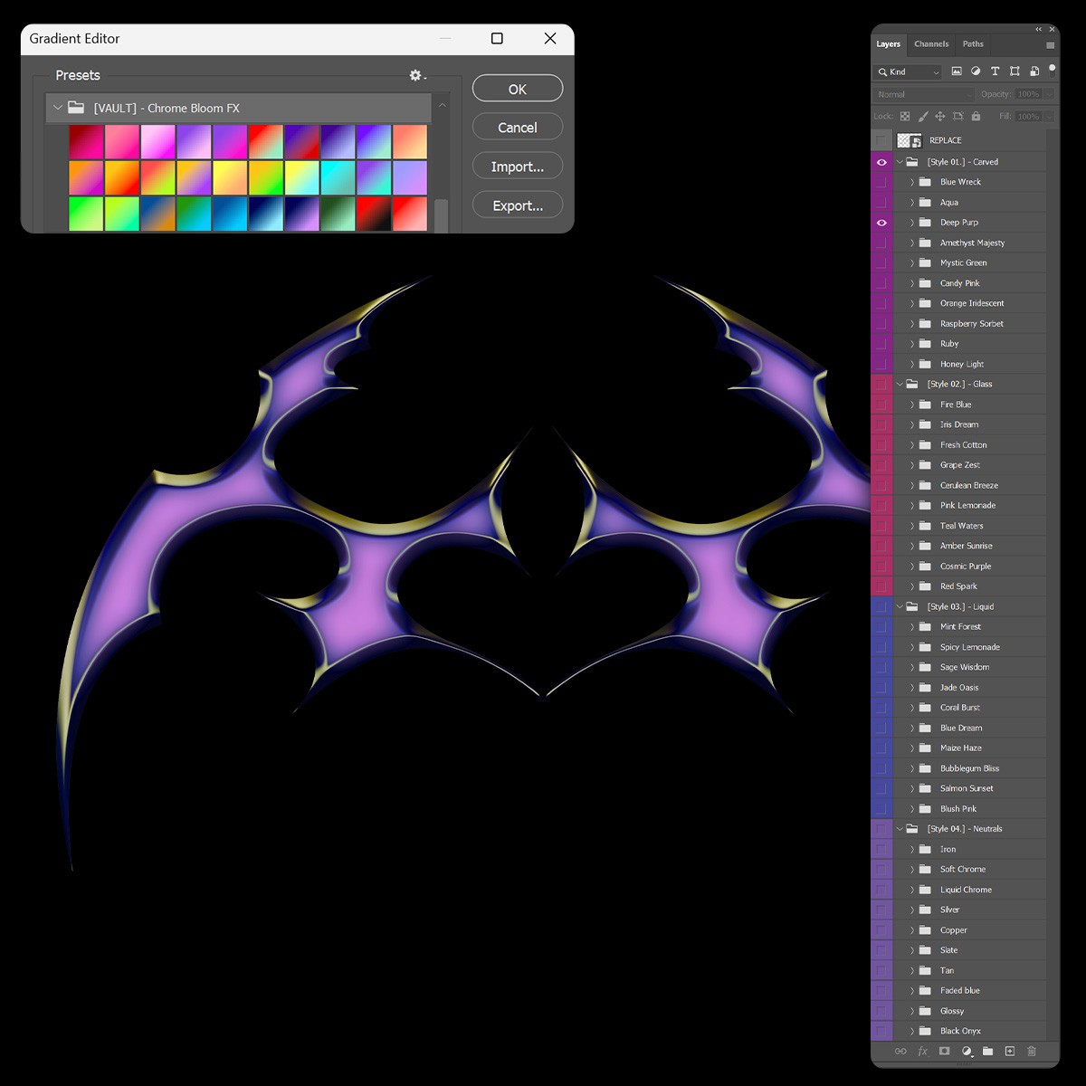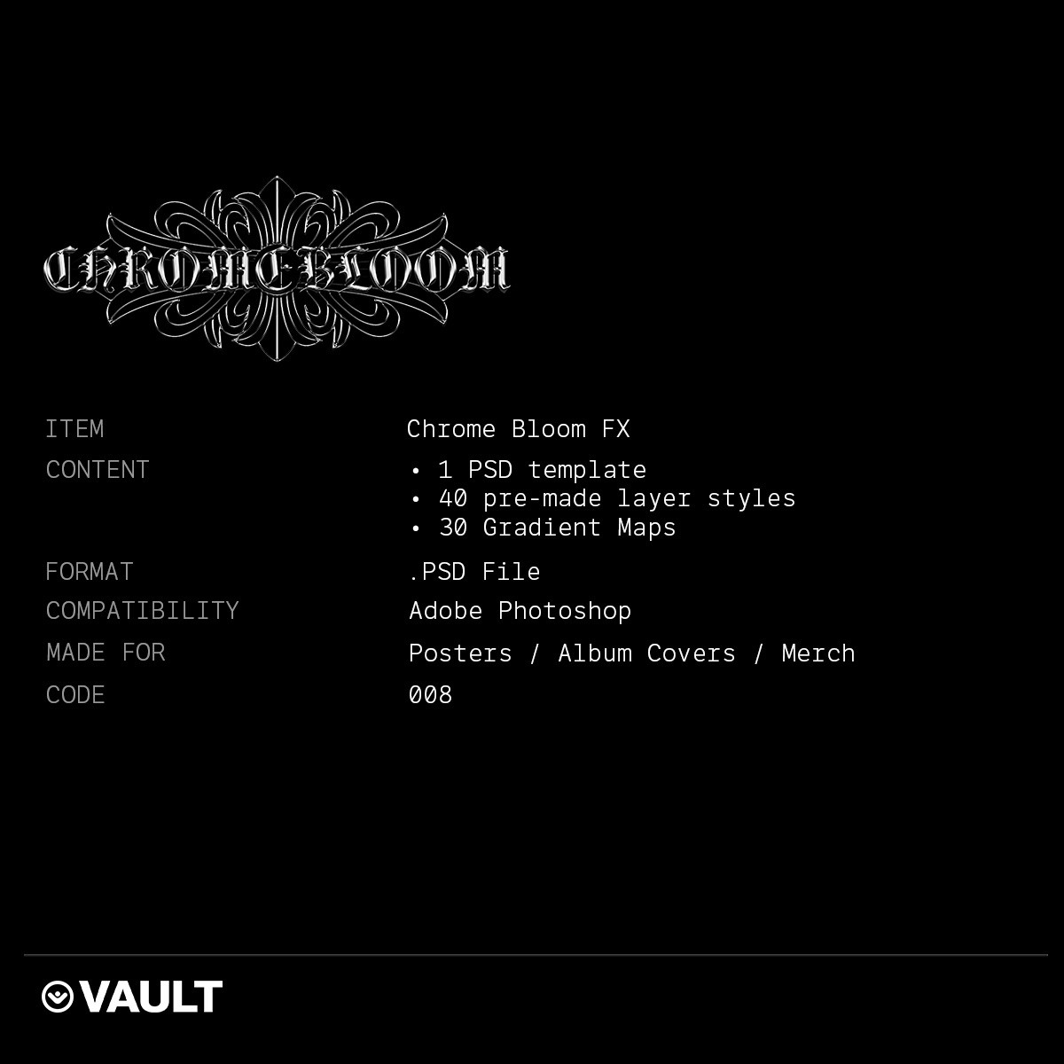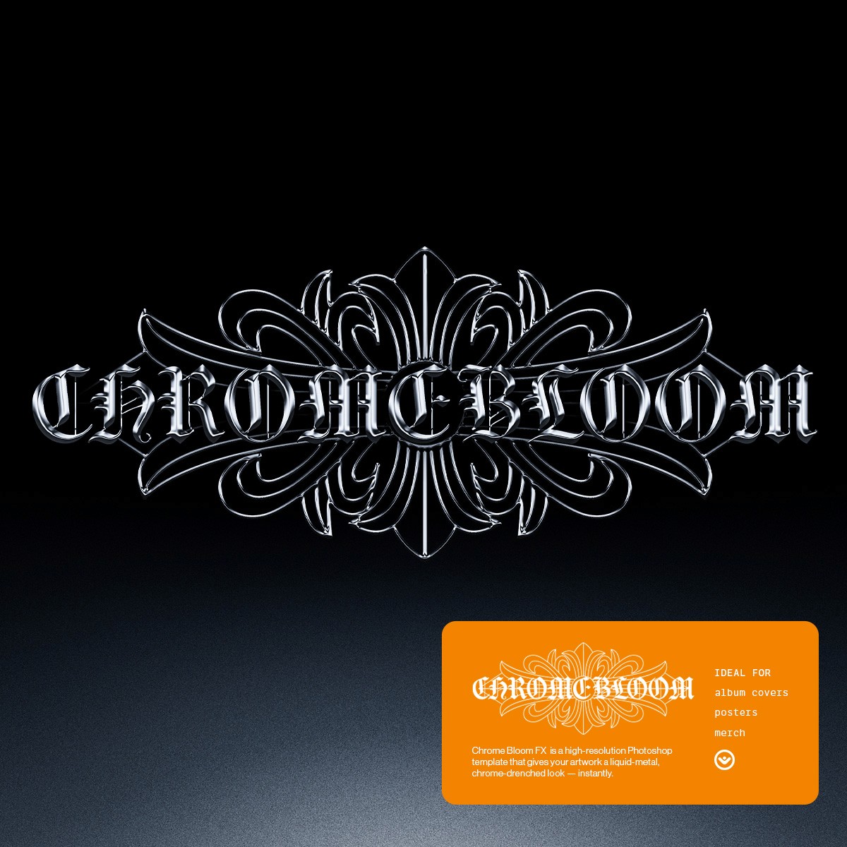 Chrome Bloom FX is a high-resolution Photoshop template that gives your artwork a liquid-metal, chrome-drenched look — instantly.